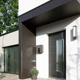 When planning an entrance door, you have to be aware of dimensions and proportions. A high-quality door leaf should be the centrepiece of the door, and by extension your home. The door should match the character of the house – classic or modern? Should you add a dash of colour? How will you control access? From a normal profile cylinder lock to access control via your smartphone – the possibilities are endless.